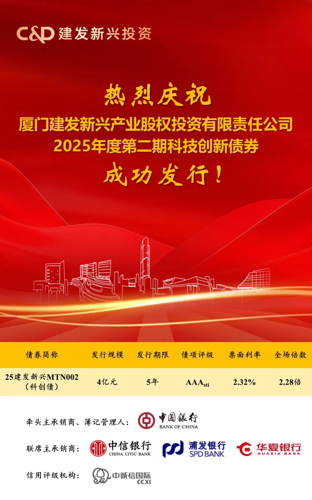 2025年8月8日,厦门建发新兴产业股权投资有限责任公司(以下简称建发新兴投资)2025年度第二期科技创新债券成功发行!本期债券发行规模4亿元,期限5年,票面利率2.32%,全场倍数2.28倍,发行利率再创公司同期限品种新低。同时,公司开展外部债权融资不到四年的时间以来,实现累计融资到账突破100亿元,债权市场认可度不断提升,内部资金运作体系更加通畅。